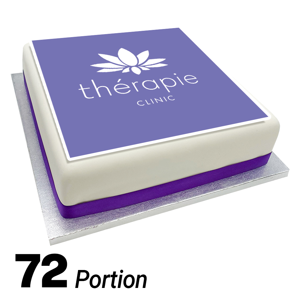 72 Portion Large Branded Cakes (based on a 2″ x 1″ party slice). Each cake is hand covered in white icing, adorned with a full-colour, edible branded topper and finished off with a coloured ribbon to the outer rim. If you need a smaller cake why not try our 20 portion postal cake.