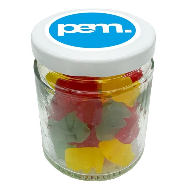 Branded Confectionery:  Approx 100g vegan-friendly Gummy Bears, packaged within an eco-friendly jar, adorned with a brandable, full-colour sticker on the lid.