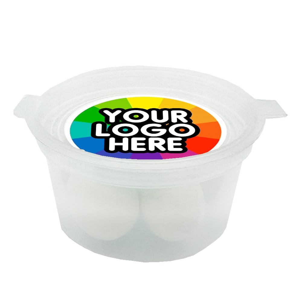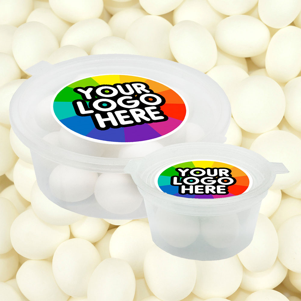 Branded Confectionery:  Choose from a medium (45g) or Small (22g) eco-tub of vegan friendly Mint Imperials! Decorated with a brandable, full-colour label.