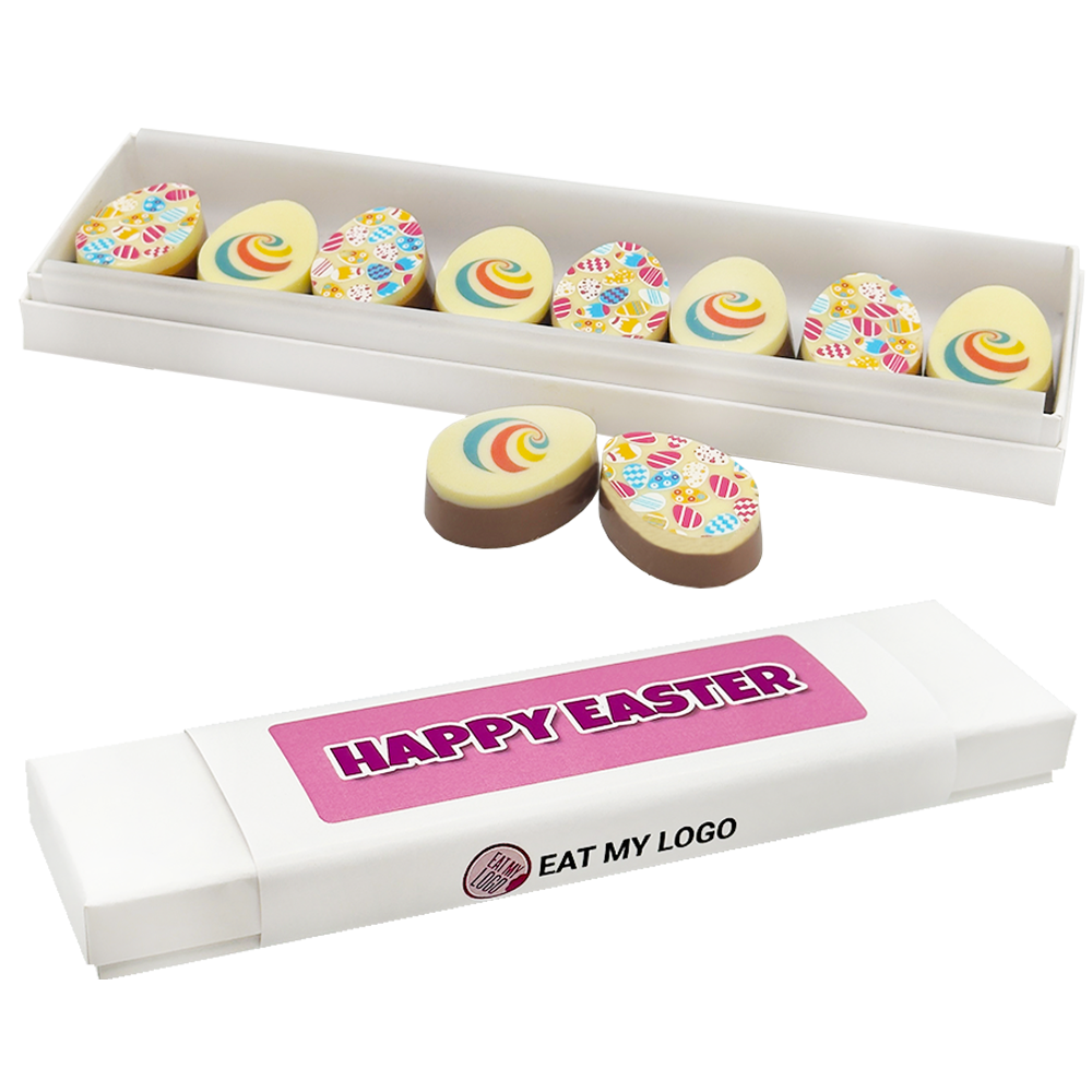 An 8pk box of Easter Chocolate Eggs, customised with branding and easter patterns