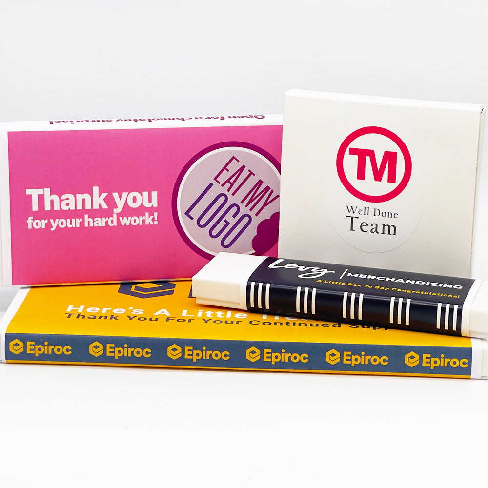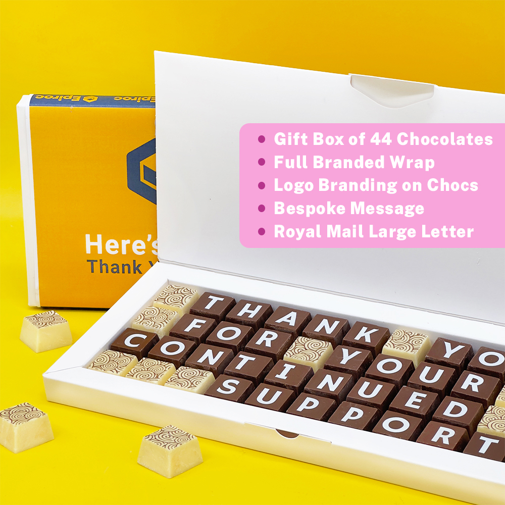 Printed Chocolates with Logo/Message: Choose your message or branding for our 44 pack logo chocolate boxes. Premium couverture chocolates packaged in a premium white gift box, finished with a brandable wrap