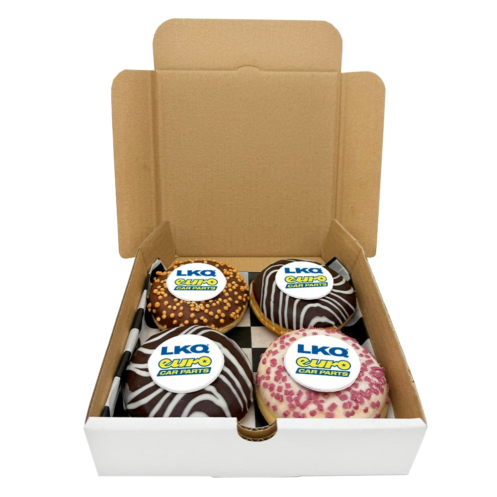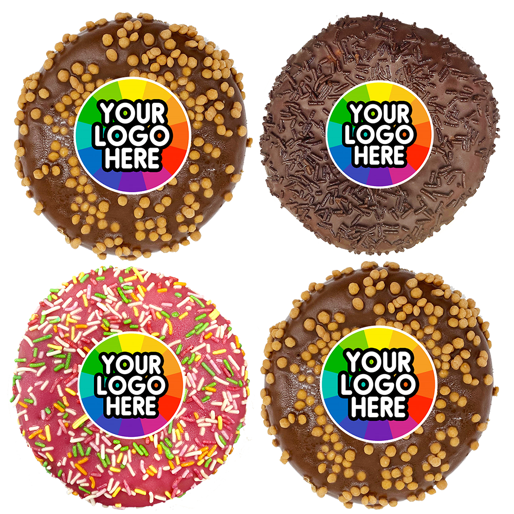 Corporate Doughnuts: A pack of 4 delicious doughnuts, adorned with a full colour, edible branded topper to each