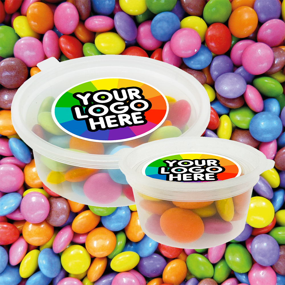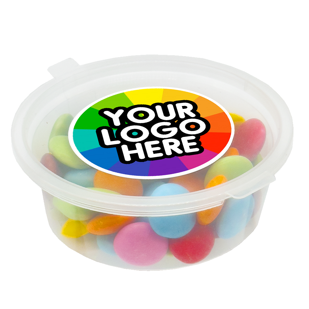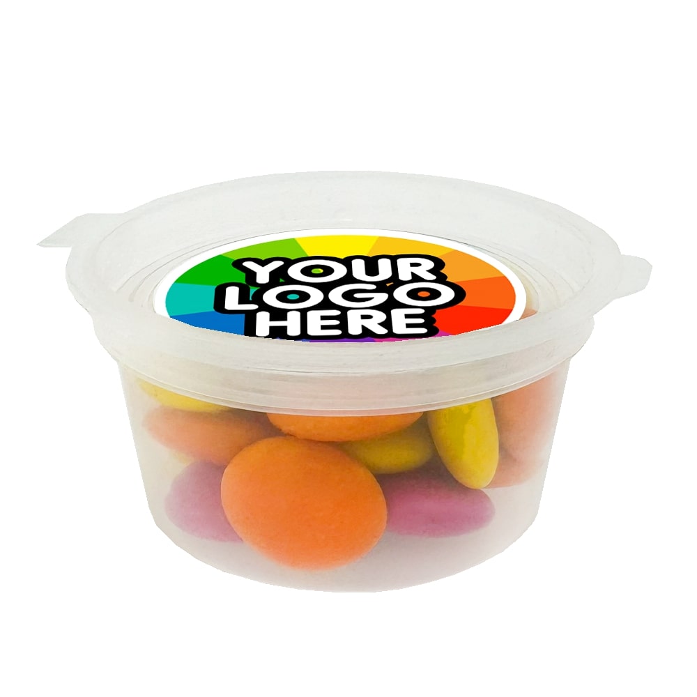 Branded Confectionery:  Approx 20g Chocolate Beans, packaged within an eco-friendly tub, adorned with a brandable, full-colour sticker on the lid.