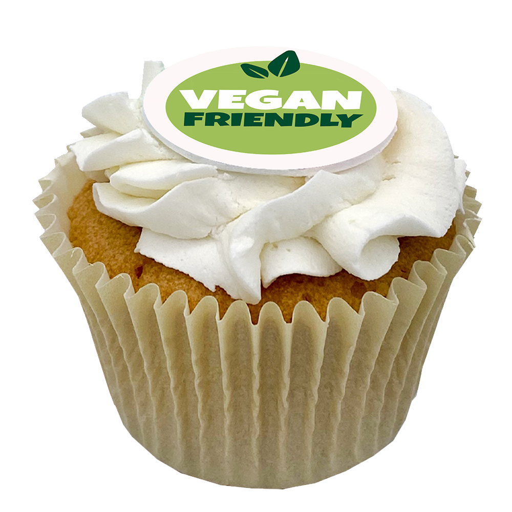 Corporate Vegan Cupcakes: Frosted Cupcakes baked to a vegan-friendly recipe, each adorned with a full colour, edible branded topper.